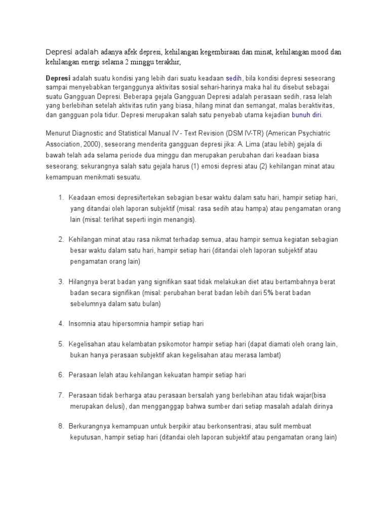 Depresi adalah gangguan suasana hati (mood) yang ditandai dengan perasaan sedih yang mendalam dan rasa tidak peduli. Gejala yang menyertainya meliputi perubahan pola tidur, nafsu makan, psikomotor, konsentrasi, anhedonia, kelelahan, putus asa, ketidakberdayaan, dan ide bunuh diri. Jenis depresi ini ditandai dengan gejala kesedihan, putus asa, dan kesepian, yang berlangsung selama lebih dari dua minggu. Apakah depresi merupakan gejala psikopatologi? Apakah depresi merupakan masalah kesehatan fisik? Sep 01, 2020 · depresi mayor adalah salah satu jenis depresi yang paling umum terdiagnosis. Depresi adalah suatu kondisi medis berupa perasaan sedih yang berdampak negatif terhadap pikiran, tindakan, perasaan, dan kesehatan mental seseorang. Depresi sering kali menjadi lebih buruk bila tidak diobati, serta mengakibatkan masalah emosional, perilaku dan kesehatan yang memengaruhi setiap area kehidupan pengidap. Simak apa saja gejala, penyebab, dan cara mengatasinya. Semua orang pasti pernah merasa sedih atau murung. Tidak ada pemeriksaan tunggal yang dapat dilakukan untuk mendiagnosis depresi. Dalam kebanyakan kasus, dokter akan menanyakan serangkaian pertanyaan tentang suasana hati, nafsu makan, pola tidur, tingkat aktivitas, dan pikiran anda. Feb 05, 2021 · depresi adalah gangguan mental yang berbeda dengan stres dan tidak boleh disepelekan.